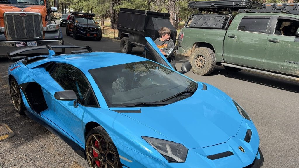 Sunday we finally had time to explore the entire Expo. We made our rounds, caught up with fellow creators, and took in the innovation on display at every booth. As we started breaking down our camp, something totally unexpected happened — a trailer rolled in carrying a Lamborghini Aventador SVJ (only 63 made!). Cayden was in his element, filming, snapping photos, and even getting to sit inside. He also scored seat time in a Porsche 911 GT3 RS — meanwhile, I was packing up our setup. Typical dad life!